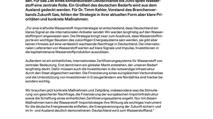 Die Bundesregierung hat heute die Wasserstoff-Importstrategie beschlossen. Für das Ziel eines klimaneutralen Deutschlands bis 2045 spielt Wasserstoff eine zentrale Rolle. Ein Großteil des deutschen Bedarfs wird aus dem Ausland gedeckt werden. Für Dr. Timm Kehler, Vorstand des Branchenverbands Zukunft Gas, fehlen der Strategie in ihrer aktuellen Form aber klare Prioritäten und konkrete Maßnahmen: