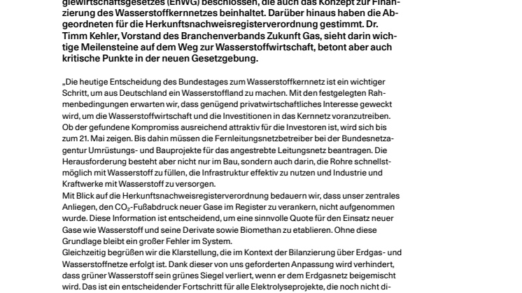 In seiner heutigen Sitzung hat der Deutsche Bundestag die Novelle des Energiewirtschaftsgesetzes (EnWG) beschlossen, die auch das Konzept zur Finanzierung des Wasserstoffkernnetzes beinhaltet. Darüber hinaus haben die Abgeordneten für die Herkunftsnachweisregisterverordnung gestimmt. Dr. Timm Kehler, Vorstand des Branchenverbands Zukunft Gas, sieht darin wichtige Meilensteine auf dem Weg zur Wasserstoffwirtschaft, betont aber auch kritische Punkte in der neuen Gesetzgebung.