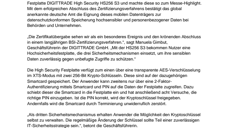 „Die Zertifikatübergabe sehen wir als ein besonderes Ereignis und den krönenden Abschluss in einem langjährigen BSI-Zertifizierungsverfahren“, sagt Manuela Gimbut, Geschäftsführerin der DIGITTRADE GmbH „Mit der HS256 S3 bekommen Nutzer eine Hochsicherheitsfestplatte, die drei Sicherheitsmechanismen einsetzt, um ihre sensiblen Daten zuverlässig gegen unbefugte Zugriffe zu schützen.“
