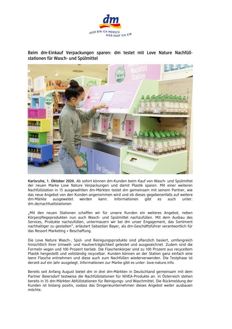 Ab sofort können dm-Kunden beim Kauf von Wasch- und Spülmittel der neuen Marke Love Nature Verpackungen und damit Plastik sparen. Mit einer weiteren Nachfüllstation in 15 ausgewählten dm-Märkten testet dm gemeinsam mit seinem Partner, wie das neue Angebot von den Kunden angenommen wird und ob dieses gegebenenfalls auf weitere dm-Märkte ausgeweitet werden kann.