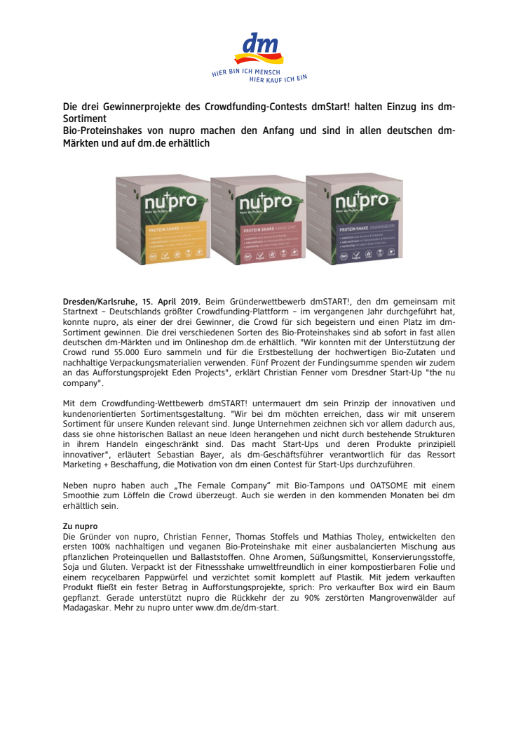 Beim Gründerwettbewerb dmSTART!, den dm gemeinsam mit Startnext – Deutschlands größter Crowdfunding-Plattform – im vergangenen Jahr durchgeführt hat, konnte nupro, als einer der drei Gewinner, die Crowd für sich begeistern und einen Platz im dm- Sortiment gewinnen.