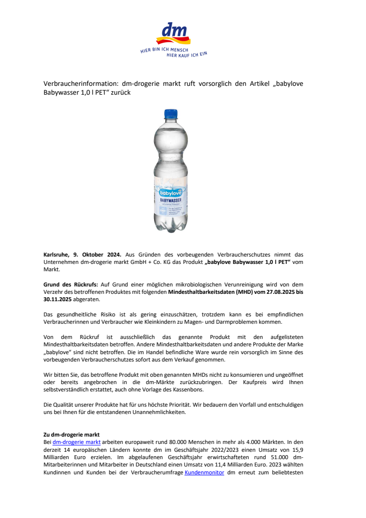 Verbraucherinformation: dm-drogerie markt ruft vorsorglich den Artikel „Babylove Babywasser 1,0 l PET“ zurück
