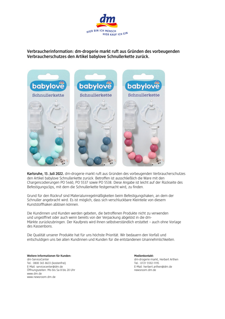 Verbraucherinformation: dm-drogerie markt ruft aus Gründen des vorbeugenden Verbraucherschutzes den Artikel babylove Schnullerkette zurück
