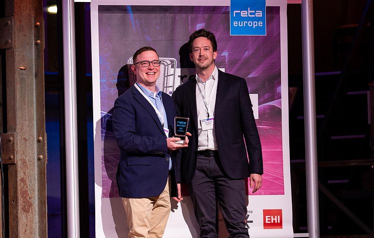 Links: Dominik Colling, dm-Projektverantwortlicher; rechts: Jan-Daivd Walte, Teamverantwortlicher bei dm, Verleihung des reta-Award an das Partner-Unternehmen Ubica-Robotics in Düsseldorf am 27. Februar 2024
