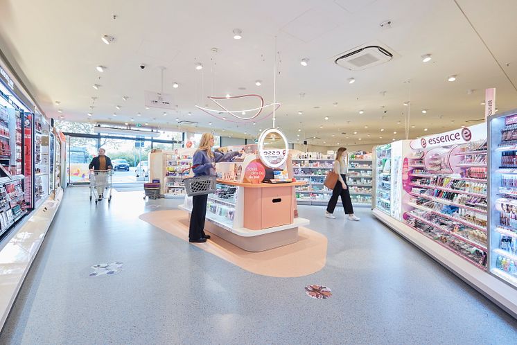 Ladendesign, Ladenbild, Beauty-Insel, Beauty-Inspirationstisch, Schönheit, Beauty, Kosmetik, Sortiment, Regale, dm-Markt, Filiale, Kunden