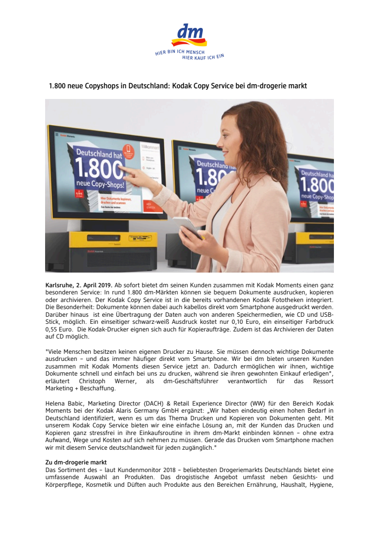 Helena Babic, Marketing Director (DACH) & Retail Experience Director (WW) für den Bereich Kodak Moments bei der Kodak Alaris Germany GmbH ergänzt: „Wir haben eindeutig einen hohen Bedarf in Deutschland identifiziert, wenn es um das Thema Drucken und Kopieren von Dokumenten geht. Mit unserem Kodak Copy Service bieten wir eine einfache Lösung an, mit der Kunden das Drucken und Kopieren ganz stressfrei in ihre Einkaufsroutine in ihrem dm-Markt einbinden können – ohne extra Aufwand, Wege und Kosten auf sich nehmen zu müssen. Gerade das Drucken vom Smartphone machen wir mit diesem Service deutschlandweit für jeden zugänglich."