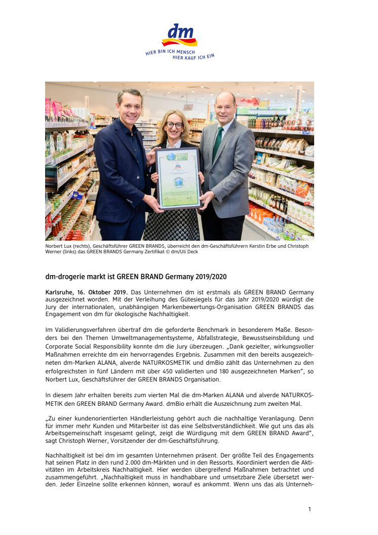 „Zu einer kundenorientierten Händlerleistung gehört auch die nachhaltige Veranlagung. Denn für immer mehr Kunden und Mitarbeiter ist das eine Selbstverständlichkeit. Wie gut uns das als Arbeitsgemeinschaft insgesamt gelingt, zeigt die Würdigung mit dem GREEN BRAND Award“, sagt Christoph Werner, Vorsitzender der dm-Geschäftsführung.