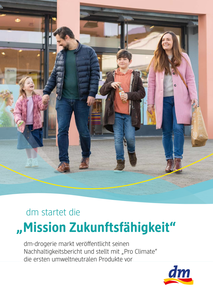 Im „Bericht zur Zukunftsfähigkeit“ wird dokumentiert, welche Haltung dm einnimmt und welche Themen und Handlungsfelder für dm von zentraler Bedeutung sind. Er zeigt, woher dm kommt, wo dm heute steht und welchen Weg die Arbeitsgemeinschaft dm in Zukunft konsequent weitergehen will. Dabei sind in acht ausgewählten Handlungsfeldern mess- und überprüfbare Ziele definiert, über deren Fortschritt dm ab sofort kontinuierlich digital berichten wird: Von der verantwortungsvollen Sortimentsgestaltung, der bestmöglichen Lieferkette über ein intelligentes Qualitäts- und Materialmanagement hin zu ganzheitlichen Klimaschutzmaßnahmen und einer dialogorientierten Arbeitsgemeinschaft mit einer facettenreichen Aus- und Weiterbildung. Neben der exzellenten Erbringung der Händlerleistung bildet der Beitrag zum Gemeinwohl und die Unterstützung des gesellschaftlichen Engagements die zweite Säule des Unternehmenszwecks.