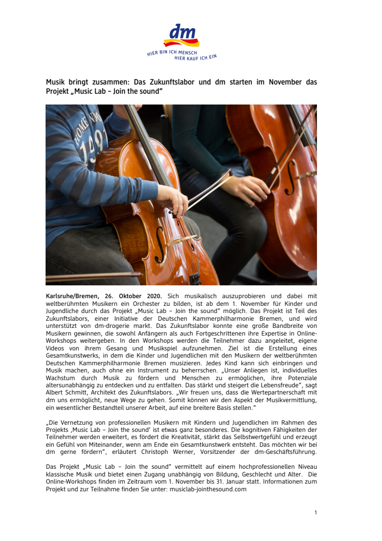 Sich musikalisch auszuprobieren und dabei mit weltberühmten Musikern ein Orchester zu bilden, ist ab dem 1. November für Kinder und Jugendliche durch das Projekt „Music Lab – Join the sound“ möglich. Das Projekt ist Teil des Zukunftslabors, einer Initiative der Deutschen Kammerphilharmonie Bremen, und wird unterstützt von dm-drogerie markt. Das Zukunftslabor konnte eine große Bandbreite von Musikern gewinnen, die sowohl Anfängern als auch Fortgeschrittenen ihre Expertise in Online- Workshops weitergeben. In den Workshops werden die Teilnehmer dazu angeleitet, eigene Videos von ihrem Gesang und Musikspiel aufzunehmen. Ziel ist die Erstellung eines Gesamtkunstwerks, in dem die Kinder und Jugendlichen mit den Musikern der weltberühmten Deutschen Kammerphilharmonie Bremen musizieren. Jedes Kind kann sich einbringen und Musik machen, auch ohne ein Instrument zu beherrschen. „Unser Anliegen ist, individuelles Wachstum durch Musik zu fördern und Menschen zu ermöglichen, ihre Potenziale altersunabhängig zu entdecken und zu entfalten. Das stärkt und steigert die Lebensfreude“, sagt Albert Schmitt, Architekt des Zukunftslabors. „Wir freuen uns, dass die Wertepartnerschaft mit dm uns ermöglicht, neue Wege zu gehen. Somit können wir den Aspekt der Musikvermittlung, ein wesentlicher Bestandteil unserer Arbeit, auf eine breitere Basis stellen.“