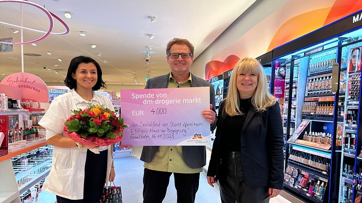Eppelheim/Karlsruhe, 17. November 2023. Gestern war es so weit: der dm-Markt in der Seestraße 71/2 in Eppelheim öffnete wieder seine Türen. Um gemeinsam mit Kundinnen und Kunden das neue, moderne Ladendesign, das erweiterte Sortimentsangebot und die hinzugekommenen Services zu feiern, lud das dm-Team einen besonderen Gast zu einer Spendenaktion ein: Der Fachleiter für Berufs- und Studienorientierung der FESCH, Marc Böhmann, übernahm von 10 bis 11 Uhr die Regie an der Kasse. Die Summe aller Einkäufe, die er über den Scanner zog, spendete das dm-Team rund um dm-Filialleiterin Edina Hoffmann zu gleichen Teilen an den Eppelheimer Sozialfond sowie dem Bürgerbeteiligungsprojekt „Haus der Begegnungen“. „Es ist großartig zu sehen, wie sehr sich unsere Kundinnen und Kunden eingesetzt haben. Insgesamt 1.10,38 Euro hat Marc Böhmann abkassiert. Die Summe runden wir gerne auf 4.000 Euro auf“, sagt Edina Hoffmann begeistert. „Wir können uns bei dm und seinen Kundinnen und Kunden nur bedanken, dass wir uns gemeinsam für wichtige Projekte hier in Eppelheim engagieren. Mit den Spendensummen werden weitere Materialien wie Gartengeräte, Laptops oder auch Geräte für Balkonkraftwerke angeschafft. So können wir die Arbeit der beiden Projekte besser fördern und weitere Gruppen initiieren“, schildert Marc Böhmann.