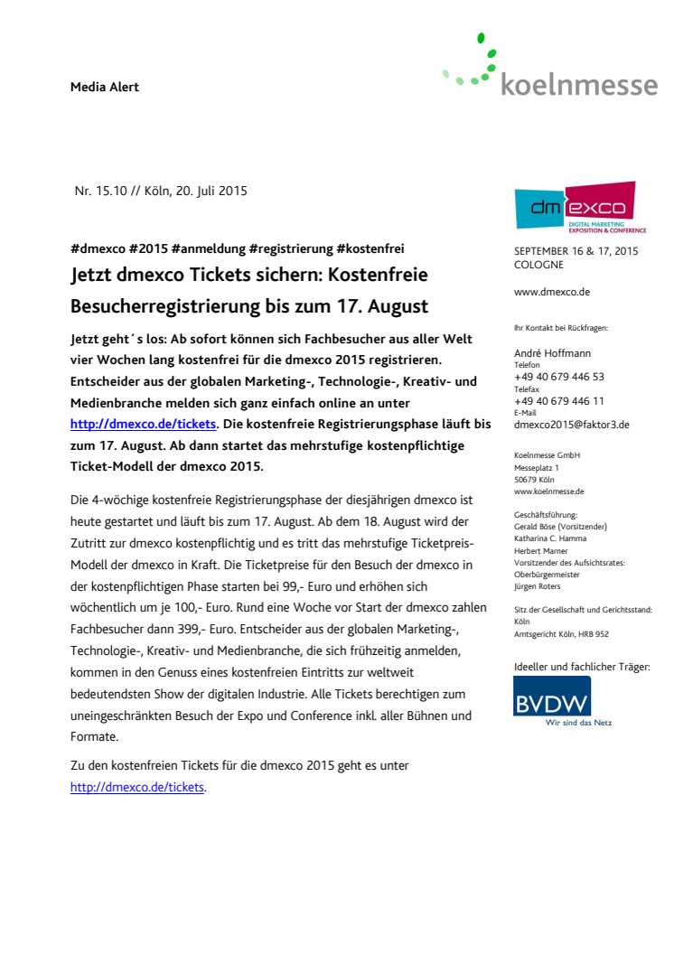 Ab sofort können sich Fachbesucher aus aller Welt 4 Wochen lang kostenfrei für die dmexco 2015 registrieren. Entscheider aus der globalen Marketing-, Technologie-, Kreativ- und Medienbranche melden sich ganz einfach online an unter http://dmexco.de/tickets. Die kostenfreie Registrierungsphase läuft bis zum 17. August. Ab dann startet das mehrstufige kostenpflichtige Ticket-Modell der dmexco 2015.