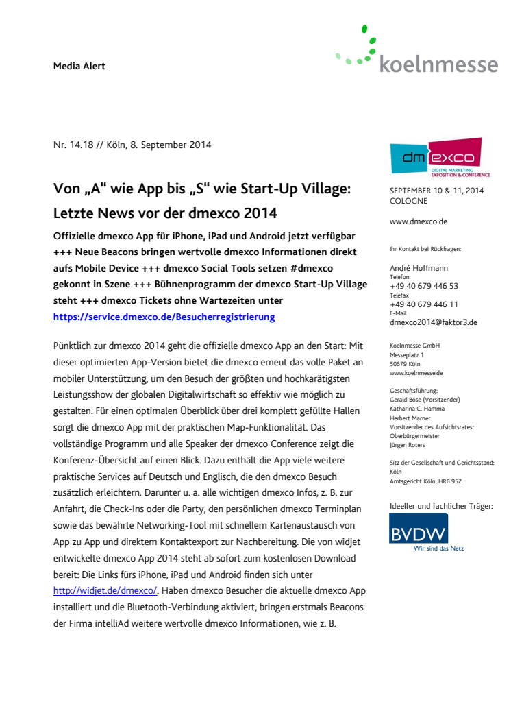Offizielle dmexco App für iPhone, iPad und Android jetzt verfügbar +++ Neue Beacons bringen wertvolle dmexco Informationen direkt aufs Mobile Device +++ dmexco Social Tools setzen #dmexco gekonnt in Szene +++ Bühnenprogramm der dmexco Start-Up Village steht +++ dmexco Tickets ohne Wartezeiten unter https://service.dmexco.de/Besucherregistrierung