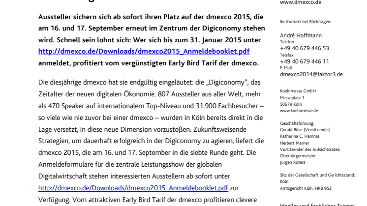 Aussteller sichern sich ab sofort ihren Platz auf der dmexco 2015, die am 16. und 17. September erneut im Zentrum der Digiconomy stehen wird. Schnell sein lohnt sich: Wer sich bis zum 31. Januar 2015 unter http://dmexco.de/Downloads/dmexco2015_Anmeldebooklet.pdf anmeldet, profitiert vom vergünstigten Early Bird Tarif der dmexco.
