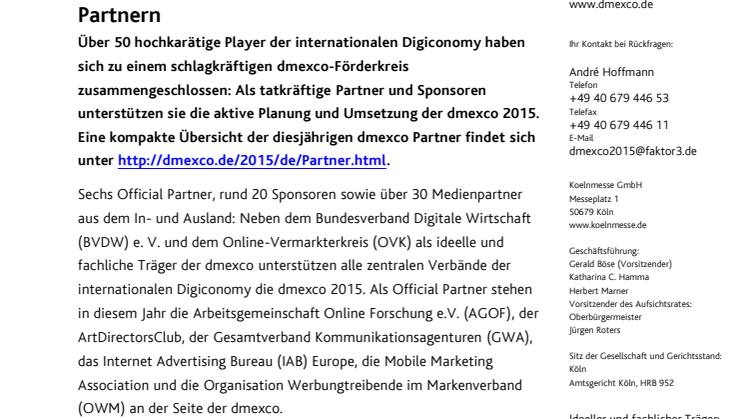 Sechs Official Partner, rund 20 Sponsoren sowie über 30 Medienpartner aus dem In- und Ausland: Über 50 hochkarätige Player der internationalen #Digiconomy haben sich zu einem schlagkräftigen dmexco-Förderkreis zusammengeschlossen. Als tatkräftige #Partner und #Sponsoren unterstützen sie die aktive Planung und Umsetzung der #dmexco 2015. Eine kompakte Übersicht der diesjährigen dmexco Partner findet sich unter http://dmexco.de/2015/de/Partner.html.