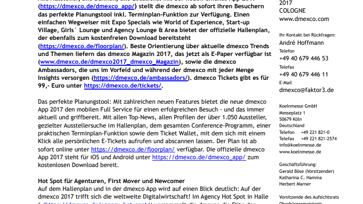 Erste Themen, Trends und Ausblicke aus wichtigen Bereichen der globalen Digitalwirtschaft sowie jede Menge inspirierende dmexco Tipps, was Besucher in der diesjährigen Expo und Conference erwartet, präsentiert das aktuelle dmexco Magazin. Das dmexco Magazin 2017 steht als E-Paper unter www.dmexco.de/dmexco2017_dmexco_Magazin zum kostenfreien Download bereit. Vor und während der dmexco liefern die dmexco Ambassadors spannende Insights. Mit Gerrit Schumann (Chief Digital Officer, Verlagsgruppe Handelsblatt), Jörg Binnenbrücker (Managing Partner, Capnamic Ventures), Klaus Eck (Geschäftsführer und Gründer von d.Tales), Falk Hedemann (Journalist, Social Media und Content-Stratege), Stefan von Gagern (Journalist, Content, PR und Social Media) und Sven Wedig (CEO & Founder Vollpension Medien) sind echte Social Media Allrounder und Digital Marketing Experten 2017 als Ambassadors der dmexco unterwegs. Weitere Infos zu den dmexco Ambassadors und ihren Kanälen finden sich unter https://dmexco.de/ambassadors/.