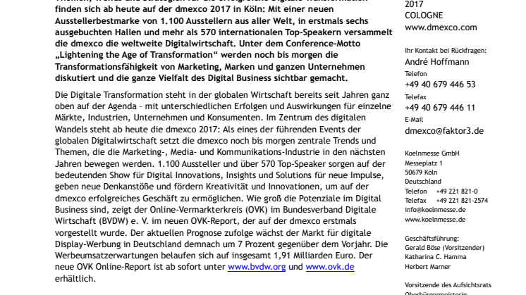 Köln, 13. September 2017 - Die Digitale Transformation steht in der globalen Wirtschaft bereits seit Jahren ganz oben auf der Agenda – mit unterschiedlichen Erfolgen und Auswirkungen für einzelne Märkte, Industrien, Unternehmen und Konsumenten. Im Zentrum des digitalen Wandels steht ab heute die dmexco 2017: Als eines der führenden Events der globalen Digitalwirtschaft setzt die dmexco noch bis morgen zentrale Trends und Themen, die die Marketing-, Media- und Kommunikations-Industrie in den nächsten Jahren bewegen werden. 1.100 Aussteller und über 570 Top-Speaker sorgen auf der bedeutenden Show für Digital Innovations, Insights und Solutions für neue Impulse, geben neue Denkanstöße und fördern Kreativität und Innovationen, um auf der dmexco erfolgreiches Geschäft zu ermöglichen. Wie groß die Potenziale im Digital Business sind, zeigt der Online-Vermarkterkreis (OVK) im Bundesverband Digitale Wirtschaft (BVDW) e. V. im neuen OVK-Report, der auf der dmexco erstmals vorgestellt wurde. Der aktuellen Prognose zufolge wächst der Markt für digitale Display-Werbung in Deutschland demnach um 7 Prozent gegenüber dem Vorjahr. Die Werbeumsatzerwartungen belaufen sich auf insgesamt 1,91 Milliarden Euro. Der neue OVK Online-Report ist ab sofort unter www.bvdw.org und www.ovk.de erhältlich.