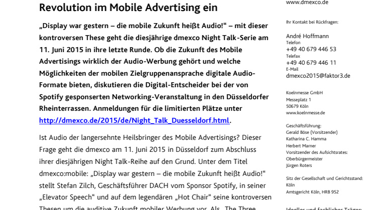 „Display war gestern – die mobile Zukunft heißt Audio!“ – mit dieser kontroversen These geht die diesjährige dmexco Night Talk-Serie am 11. Juni 2015 in ihre letzte Runde. Ob die Zukunft des Mobile Advertisings wirklich der Audio-Werbung gehört und welche Möglichkeiten der mobilen Zielgruppenansprache digitale Audio-Formate bieten, diskutieren die Digital-Entscheider bei der von Spotify gesponserten Networking-Veranstaltung in den Düsseldorfer Rheinterrassen. Anmeldungen für die limitierten Plätze sind ab sofort unter http://dmexco.de/2015/de/Night_Talk_Duesseldorf.html möglich.