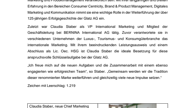 Zuletzt war Claudia Staber als VP International Marketing und Mitglied der Geschäftsleitung bei BERNINA International AG tätig. Zuvor verantwortete sie in verschiedenen Unternehmen der Luxus-, Tourismus- und Konsumgüterbranche das internationale Marketing. Mit ihrem beeindruckenden Leistungsausweis und einem Abschluss als Lic. Oec. HSG ist Claudia Staber die ideale Besetzung für diese anspruchsvolle Schlüsselaufgabe bei der Glatz AG.