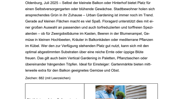 Selbst der kleinste Balkon oder Hinterhof bietet Platz für einen Selbstversorgergarten oder blühende Gewächse. Stadtbewohner holen sich ansprechendes Grün in ihr Zuhause – Urban Gardening ist immer noch im Trend. Gerade auf kleinen Flächen macht es viel Spaß. Floragard unterstützt dies mit einer großen Auswahl an passenden und auch torfreduzierten und torffreien Spezialerden – ob für Zwergobstbäume im Kasten, Beeren in der Blumenampel, Gemüse in kleinen Hochbeeten, Kräuter in Balkonkästen oder mediterrane Pflanzen im Kübel. Wer den zur Verfügung stehenden Platz gut nutzt, kann sich mit den optimal abgestimmten Substraten über eine reiche Ernte oder üppige Blüte freuen. Das gilt auch beim Vertical Gardening in Paletten, Pflanztaschen oder übereinander hängenden Töpfen. Ideal für Einsteiger: Gartenmärkte bieten mittlerweile extra für den Balkon geeignetes Gemüse und Obst.