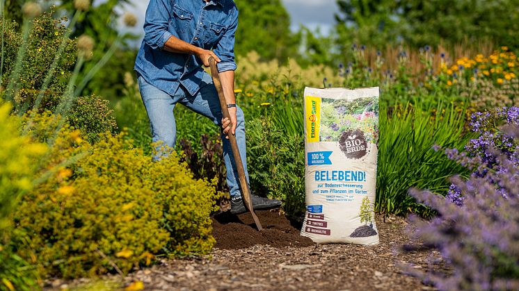 Im Beet speichert eine Humusschicht, am besten aus dem eigenen Kompost, das Wasser und gibt es langsam wieder an die Pflanzen ab. Eine Schicht Mulch aus Rasenschnitt oder Ernteresten schützt den Boden ebenfalls vor Austrocknung. An trockene Verhältnisse passt sich auch ein Boden an, der nur leicht gelockert und nicht zu tief umgegraben wird. Hobbygärtner sollten außerdem für ihre Projekte ein hoch-wertiges Substrat verwenden. Zum Pflanzen von Gehölzen, Stauden, Sträuchern und Hecken eignet sich beispielsweise die torffreie und vegane Bio-Spezialerde Belebend! von Floragard.