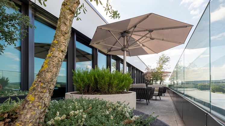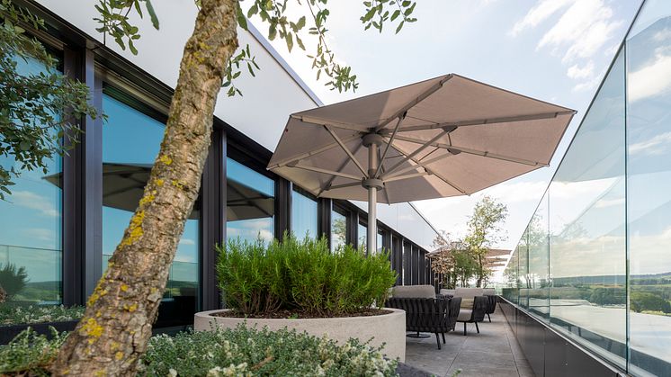 Die besonders hochwertigen Schirmbezüge der höchsten Stoffqualität 5 sind in 55 verschiedenen Farbnuancen verfügbar. So lässt sich das Farbkonzept des Gebäudes im Outdoor-Bereich fortsetzen. Gegen Aufpreis sind Mast und Schirmgestell in sämtlichen RAL-Farben erhältlich.