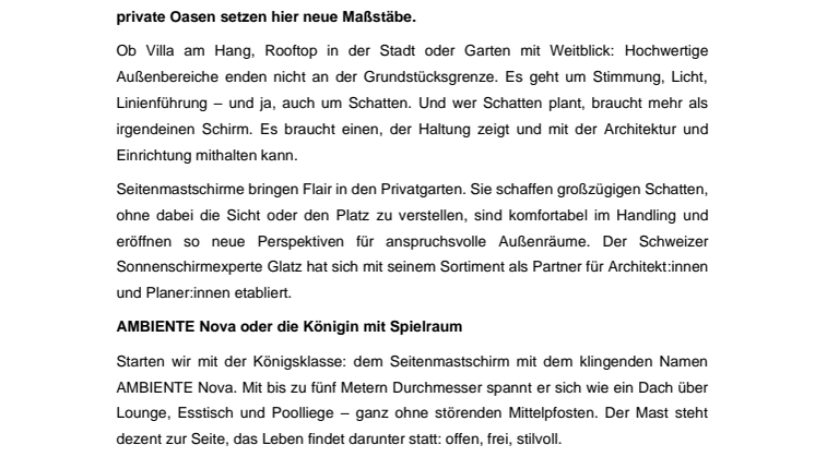 Der Schweizer Sonnenschirmhersteller Glatz AG mit Sitz in Frauenfeld verbindet seit 1895 handwerkliche Tradition mit innovativem Design. Ein Marktführer in Europa, der individuelle Sonnenschutzlösungen sowohl für den Privat- als auch für den Objektbereich bietet. Mit einer beeindruckend breiten Palette an Kombinationsmöglichkeiten und einem tief verankerten Qualitätsanspruch steht Glatz für mehr als nur Schatten: für ein Stück Lebensqualität, direkt aus der Schweiz.