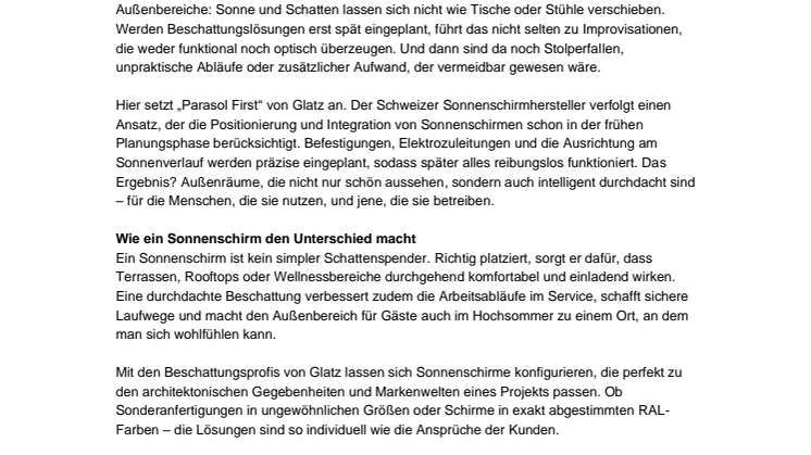 Die beste Beschattung ist die, die von Anfang an mitgedacht wird. Mit dem Ansatz „Parasol First“ zeigt Sonnenschirmhersteller Glatz, wie frühzeitige Planung Außenräume nicht nur ästhetisch, sondern auch funktional und wirtschaftlich perfekt macht.