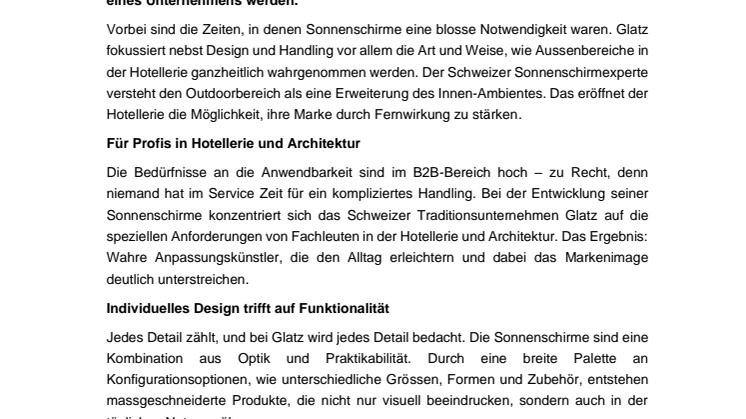 Die Bedürfnisse an die Anwendbarkeit sind im B2B-Bereich hoch – zu Recht, denn niemand hat im Service Zeit für ein kompliziertes Handling. Bei der Entwicklung seiner Sonnenschirme konzentriert sich das Schweizer Traditionsunternehmen Glatz auf die speziellen Anforderungen von Fachleuten in der Hotellerie und Architektur. Das Ergebnis: Wahre Anpassungskünstler, die den Alltag erleichtern und dabei das Markenimage deutlich unterstreichen.