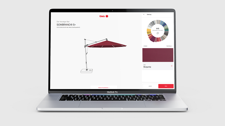 Um Kunden den Kauf eines neuen Schattenspenders so komfortabel wie möglich zu gestalten, hat der Schweizer Sonnenschirmprofi Glatz einen Konfigurator entwickelt. Dieser ist ab sofort online auf www.glatz.com verfügbar und sorgt schon bei der Auswahl von Modell und Farbe für Vorfreude auf einen einzigartigen Sonnenschirm.