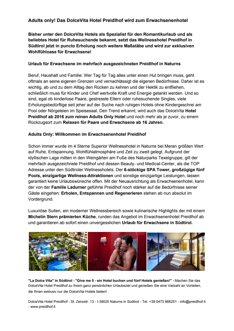 Bisher unter den DolceVita Hotels als Spezialist für den Romantikurlaub und als beliebtes Hotel für Ruhesuchende bekannt, setzt das Wellnesshotel Preidlhof in Südtirol jetzt in puncto Erholung noch weitere Maßstäbe und wird zur exklusiven Wohlfühloase für Erwachsene!