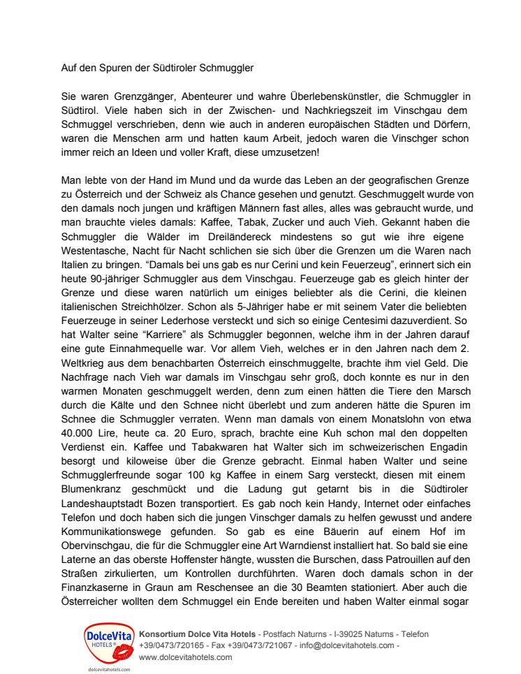 Sie waren Grenzgänger, Abenteurer und wahre Überlebenskünstler, die Schmuggler in Südtirol. Viele haben sich in der Zwischen- und Nachkriegszeit im Vinschgau dem Schmuggel verschrieben, denn wie auch in anderen europäischen Städten und Dörfern, waren die Menschen arm und hatten kaum Arbeit, jedoch waren die Vinschger schon immer reich an Ideen und voller Kraft, diese umzusetzen!
