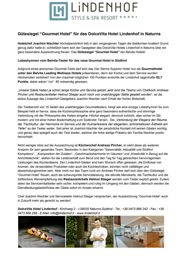 Hotelchef Joachim Nischler höchstpersönlich ließ in den vergangenen Tagen die Sektkorken knallen! Grund genug dafür hatte er, schließlich kann sich der Gastgeber des DolceVita Hotels Lindenhof in Naturns über eine ganz besondere Auszeichnung freuen: Das Gütesiegel “Gourmet Hotel” der Belvita Hotels!