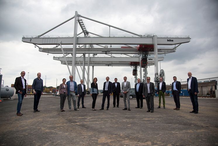 Gruppenbild der TBOS- und CTO-Verantwortlichen an den Portalkränen des neuen Containerterminals Osnabrück