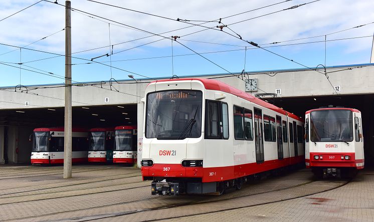 Die neue Stadtbahn (vorne) neben einer alten Bahn (rechts).