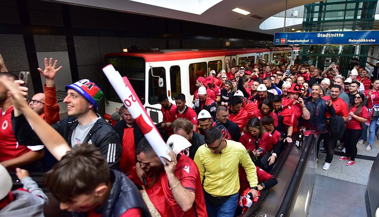 Albanische Fans an der Haltestelle Westfalenhalle während der EURO 2024 in Dortmund.