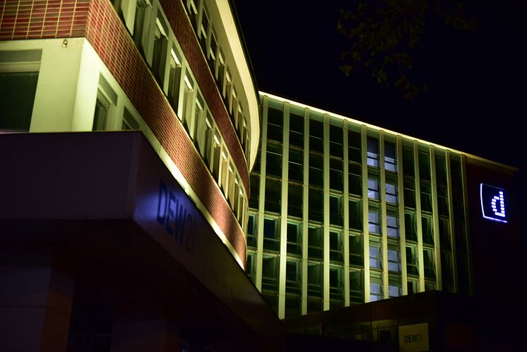 Im Herzen der City leuchtet die Fassade der DEW21 gelb