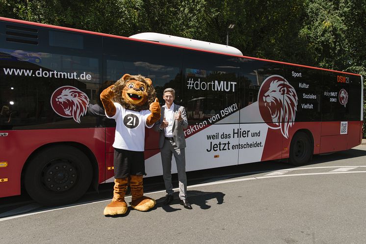 DSW21-Finanzvorstand Jörg Jacoby und der Löwe aus dem #dortMUT-Logo als Maskottchen der 21-Gruppe schickten pünktlich zum Bewerbungsstart den DSW21-Linienbus für den Förderwettbewerb „auf Strecke“