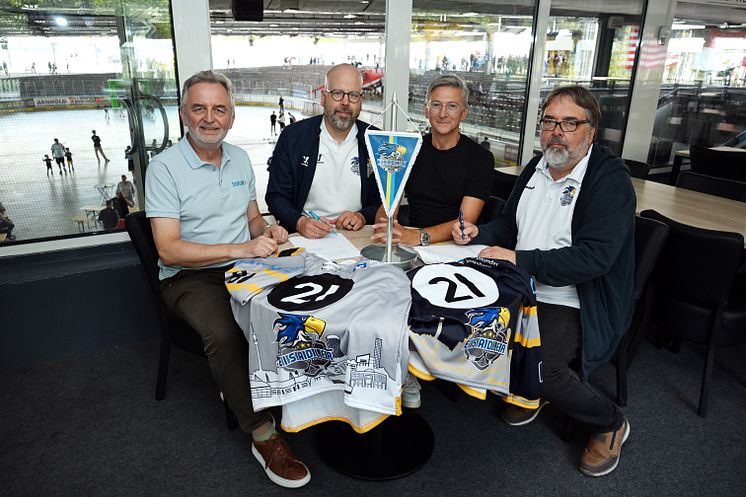 Bei der Vertragsunterschrift (von links nach rechts): Richard Genuit (Geschäftsführer DOKOM21), Stefan Witte (1. Vorsitzender Eisadler), Jörg Jacoby (Vorstandssprecher DSW21) und Werner Bracht (2. Vorsitzender Eisadler).