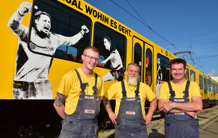 Die Lackierer von DSW21 haben die schönste BVB-Bahn der Geschichte realisiert. von links: Benedikt Schweins, Rafael Grochol und Uwe Clemens