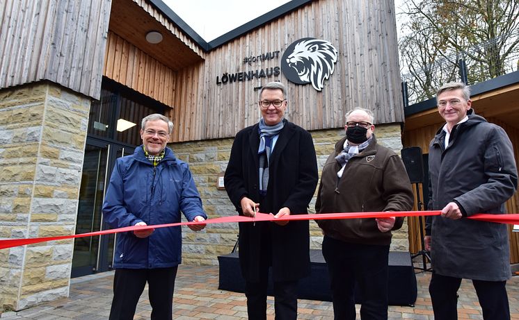 OB Thomas Westphal, Zoodirektor Dr. Frank Brandstätter und Hubert Jung sowie Jörg Jacoby von DSW21 eröffnen das Löwenhaus