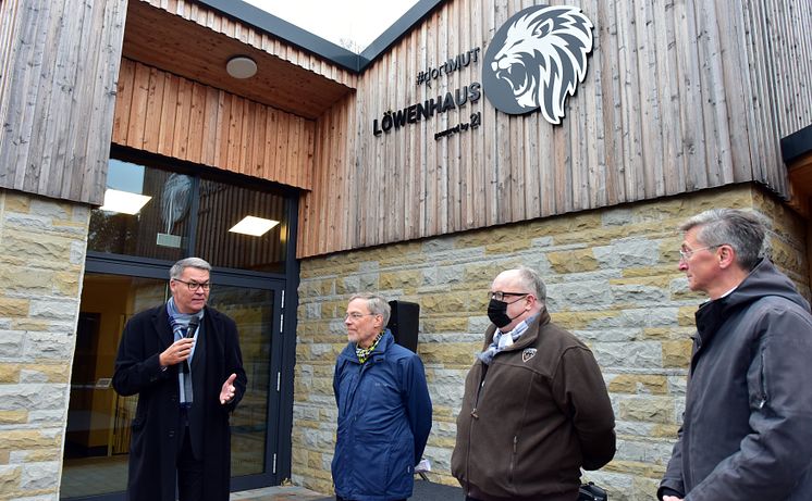 OB Thomas Westphal, Zoodirektor Dr. Frank Brandstätter und Hubert Jung sowie Jörg Jacoby von DSW21 eröffnen das Löwenhaus