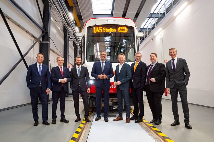 Im Bild von links nach rechts: Guntram Pehlke (Vorstandsvorsitzender DSW21), Hubert Jung (Verkehrsvorstand DSW21), Samuel Kermelk (Geschäftsführer Heiterblick), Thomas Westphal (OB Dortmund und AR-Vorsitzender DSW21), Alexander Ketterl (Geschäftsführer Kiepe Electric), Ulrich Jaeger (Vorstandsmitglied DSW21, ab 1.1.2023 Verkehrsvorstand), Harald Kraus (Arbeitsdirektor DSW21) und Jörg Jacoby (Finanzvorstand DSW21).