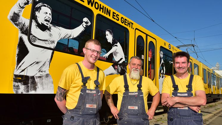 31 Jahre ist das jetzt her. Povlsen ist längst eine Dortmunder Legende. Und Wagen 320-2 irgendwie auch. Er rollt und rollt und rollt. Und der Lack ist auch nach drei Jahrzehnten keinesfalls ab, sondern –im Gegenteil – ganz frisch drauf. „Legendenbahn“ heißt das frisch renovierte und lackierte Fahrzeug mit seinen stolzen 37,5 Tonnen Eigengewicht jetzt hochoffiziell. Denn auf der Bahn, die ab sofort durch Dortmund rollen wird, sind die BVB-Legenden Wolfgang Paul, Michael Zorc, Nobby Dickel, Lars Ricken, Kalle Riedle, Sebastian Kehl, Patrick Owomoyela und Roman Weidenfeller zu sehen. Über ihnen thront die Textzeile „Wir folgen Dir, egal wohin es geht“ aus dem gleichfalls legendären Fangesang. Und natürlich zieren auch die Logos von BVB und der kommunalen Unternehmensfamilie 21 – seit diesem Jahr Nachhaltigkeits- und Markenpartner – das Fahrzeug.