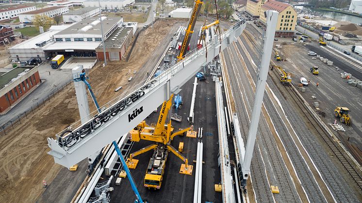 DSW21 und die Stadtwerke Osnabrück bauen gemeinsam ein neues Containerterminal am Osnabrücker Hafen. Dort hat nun der spektakuläre Aufbau der Portalkräne begonnen. Ein Spezialkran hat die einzelnen Trägerteile für die beiden jeweils rund fünfzig Meter breiten und gut vierzig Meter hohen Portalkräne aufgerichtet. Der komplette Terminalbau soll im Sommer abgeschlossen sein.