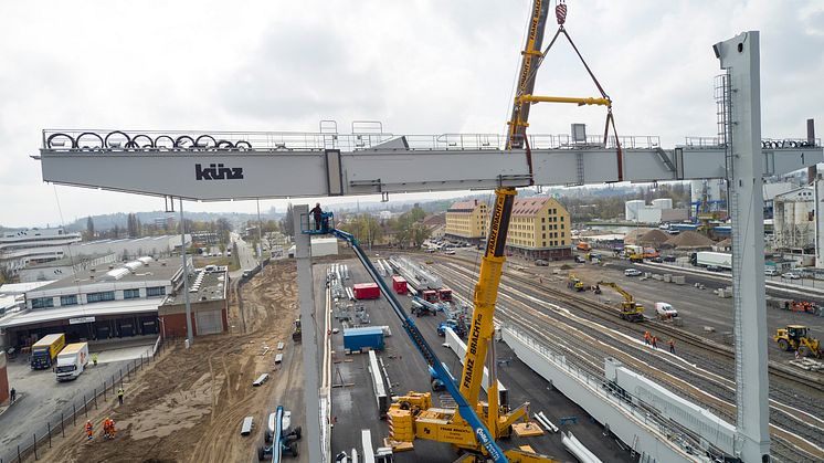 Der Aufbau der beiden Portalkräne – Kran Zwei folgt ab dem 26. April – bildet den Höhepunkt der Bauarbeiten auf der insgesamt rund 9,5 Hektar großen ehemaligen Kasernenfläche am Hafen. Der Terminalbau war vor einem Jahr gestartet und soll im Sommer planmäßig abgeschlossen sein. Bis zu 150.000 Ladeeinheiten pro Jahr sollen über das neue Containerterminal von der Straße auf die Schiene umgeschlagen werden. 29 Millionen Euro investieren die TBOS-Gesellschafter in den Bau der Anlage. Das Bundesverkehrsministerium fördert den Bau mit 22 Millionen Euro.
