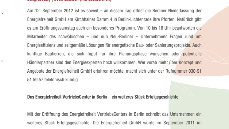 Mit der Eröffnung des Energiefreiheit VertriebsCenters in Berlin schreibt das Unternehmen ein weiteres Stück Erfolgsgeschichte. Die Energiefreiheit GmbH wurde im September 2011 im schwäbischen Riedlingen gegründet und ist heute mit mehr als 120 Händlerpartnern im gesamten Bundesgebiet präsent. Mit den VertriebsCentern in Heddesheim/Baden-Württemberg und Berlin sowie zahlreichen regionalen VertriebsStudios verfügt sie über eine exzellente strukturelle Basis. Neben ihrer Expansion in Deutschland ist die Energiefreiheit GmbH seit längerem auch auf dem internationalen Markt präsent, im Fokus stehen hier vorerst die Schweiz sowie Südosteuropa.