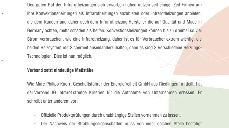 Wie Marc-Philipp Knorr, Geschäftsführer der Energiefreiheit GmbH aus Riedlingen, mitteilt, hat der Verband IG Infrarot strenge Kriterien für die Aufnahme von Unternehmen erlassen. Er schreibt unter anderem vor: