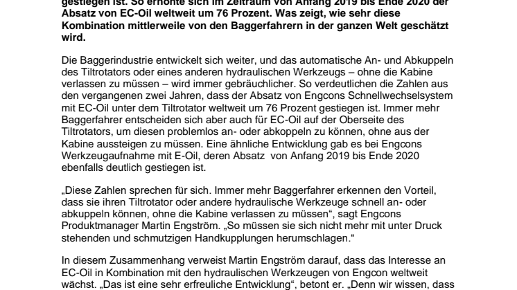 engcon ist ein weltweit führender Hersteller von Tiltrotatoren und unterschiedlichsten Anbaugeräten, mit denen die Effizienz, Flexibilität, Rentabilität, Sicherheit und Nachhaltigkeit von Baggern verbessert wird. Unter unserer eigenen Marke bieten wir ein einzigartiges Tiltrotatorsystem an, das den Bagger in einen vielseitig einsetzbaren Geräteträger verwandelt, der unterschiedlichste Arbeiten erledigen und somit andere Maschinen ersetzen kann. Wir bedienen weltweit den Markt über unsere lokalen Vertriebsgesellschaften und ein etabliertes Netz von Fachhändlern.