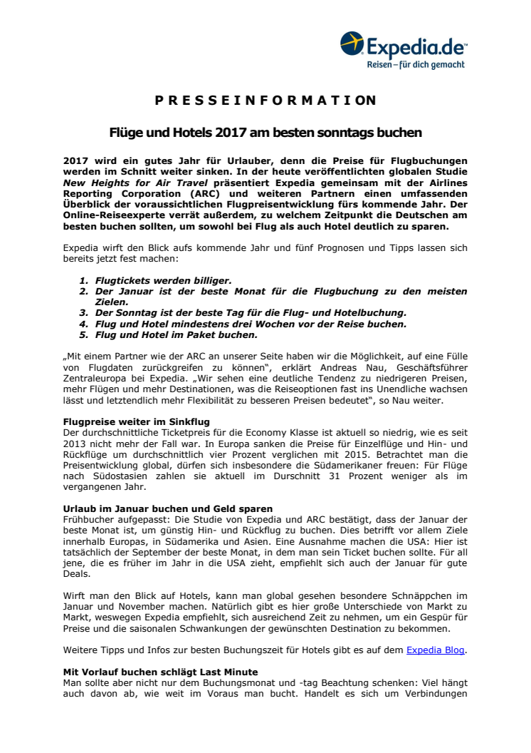 2017 wird ein gutes Jahr für Urlauber, denn die Preise für Flugbuchungen werden im Schnitt weiter sinken. In der heute veröffentlichten globalen Studie "New Heights for Air Travel" präsentiert Expedia gemeinsam mit der Airlines Reporting Corporation (ARC) und weiteren Partnern einen umfassenden Überblick der voraussichtlichen Flugpreisentwicklung fürs kommende Jahr.