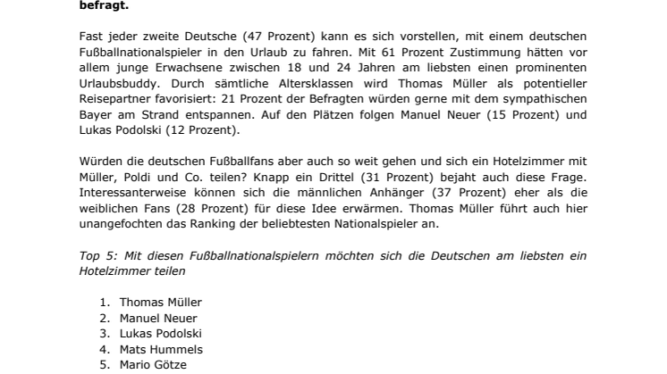 Fast jeder zweite Deutsche (47 Prozent) kann es sich vorstellen, mit einem deutschen Fußballnationalspieler in den Urlaub zu fahren. Mit 61 Prozent Zustimmung hätten vor allem junge Erwachsene zwischen 18 und 24 Jahren am liebsten einen prominenten Urlaubsbuddy. Durch sämtliche Altersklassen wird Thomas Müller als potentieller Reisepartner favorisiert: 21 Prozent der Befragten würden gerne mit dem sympathischen Bayer am Strand entspannen. Auf den Plätzen folgen Manuel Neuer (15 Prozent) und Lukas Podolski (12 Prozent).